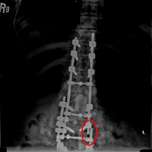 So we once again find our self in the same position we have been in twice over the past year. Through the x-rays we found that Joey had somehow broken the rods placed in his back during the last round of surgeries. In the pics below the broken rods are circled in red.